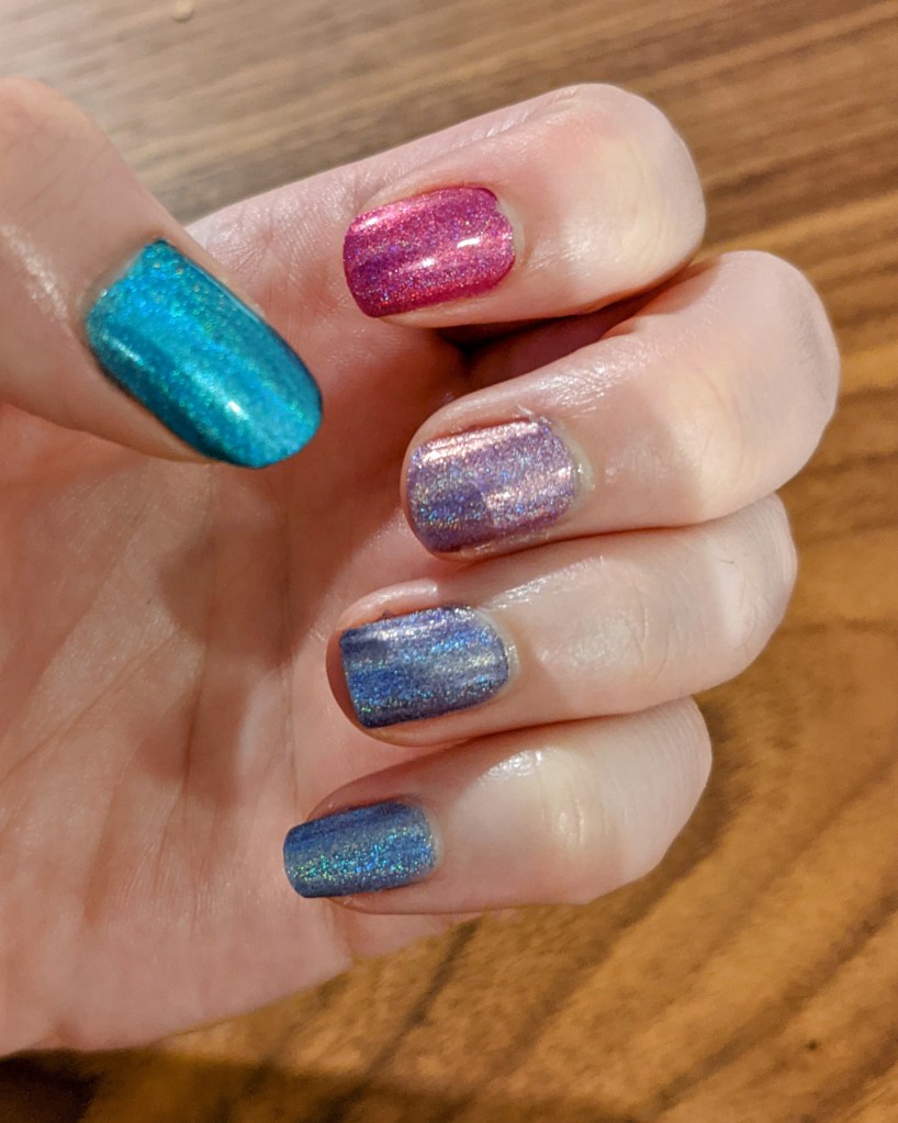 Hydropower is my favorite polish from Holo Taco – it’s a vibrant aqua that feels like summer to me. Hot-wire Pink is a bright hot pink, and it’s a color I was always hoping to have in this formula. Pink Fizz is a cool toned pink that leans purple. I was hoping for something more pink when it first came out, but now that I have Hot-wire Pink, I have exactly the pink I was looking for. Lavender Syrup is a pale cool toned lavender that I find leans on the blue side. Sparkling Water is a soft blue shade that is so pretty for spring and summer.