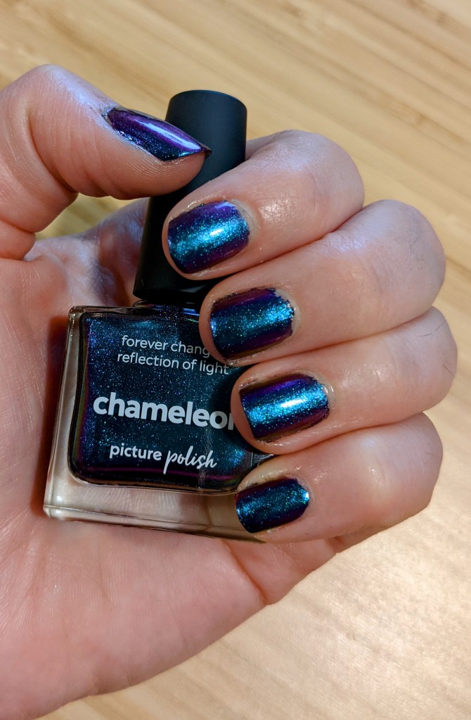 Chameleon is a green/blue/purple multi chrome nail polish. Depending on the light and angle, it will show up as a different color, and I couldn’t be happier. This is by far my favorite multi chrome formula that I’ve tried – it’s fully opaque in two coats (though you migh tneed 3 if you have longer nails), and the sparkles in it make it truly unique. I also love how it doesn’t require a black base coat, which is rare in this kind of formula as most multi chrome polishes tend to need a black base coat to show up.
