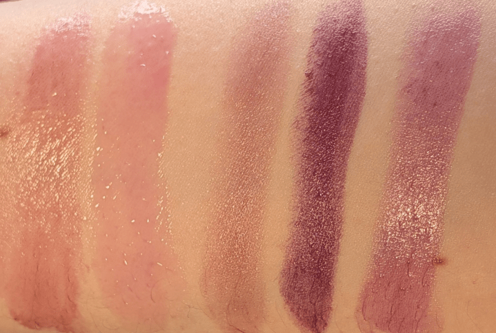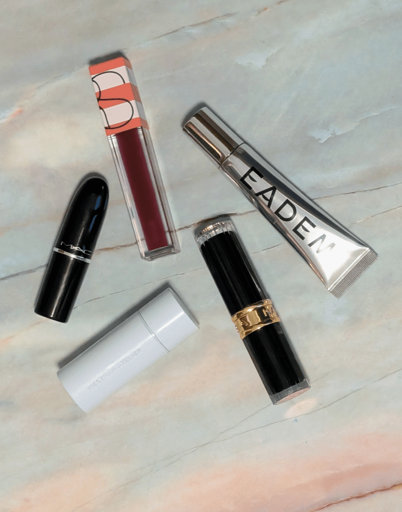 Left to right: Eadem Le Chouchou Lip Softening Balm in Bissap Glaze, Nars Afterglow Lip Oil in Wonderous 520, Westman Atelier Hydro Balm Tinted Lipstick in Onyx, MAC Lustreglass Lipstick in Succumb to Plum, Nabla Beyond Jelly Sheer Lipstick in Nocturna