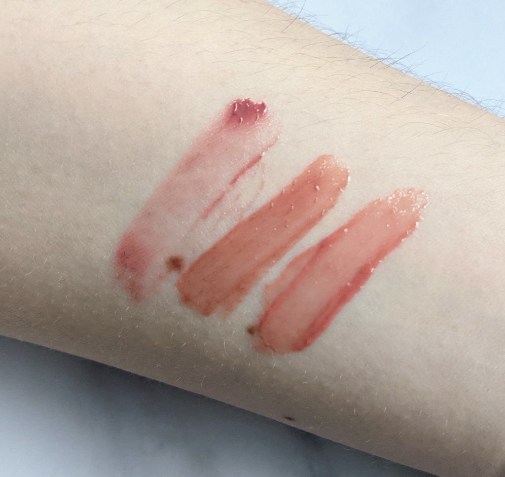 Sephora Collection Melting Lip Click in Caramel, Lisa Eldridge Gloss Embrace Lip Gloss in Muse, and Vesca Lush Glow Creamy Lip Oil in Ginger Lily from left to right