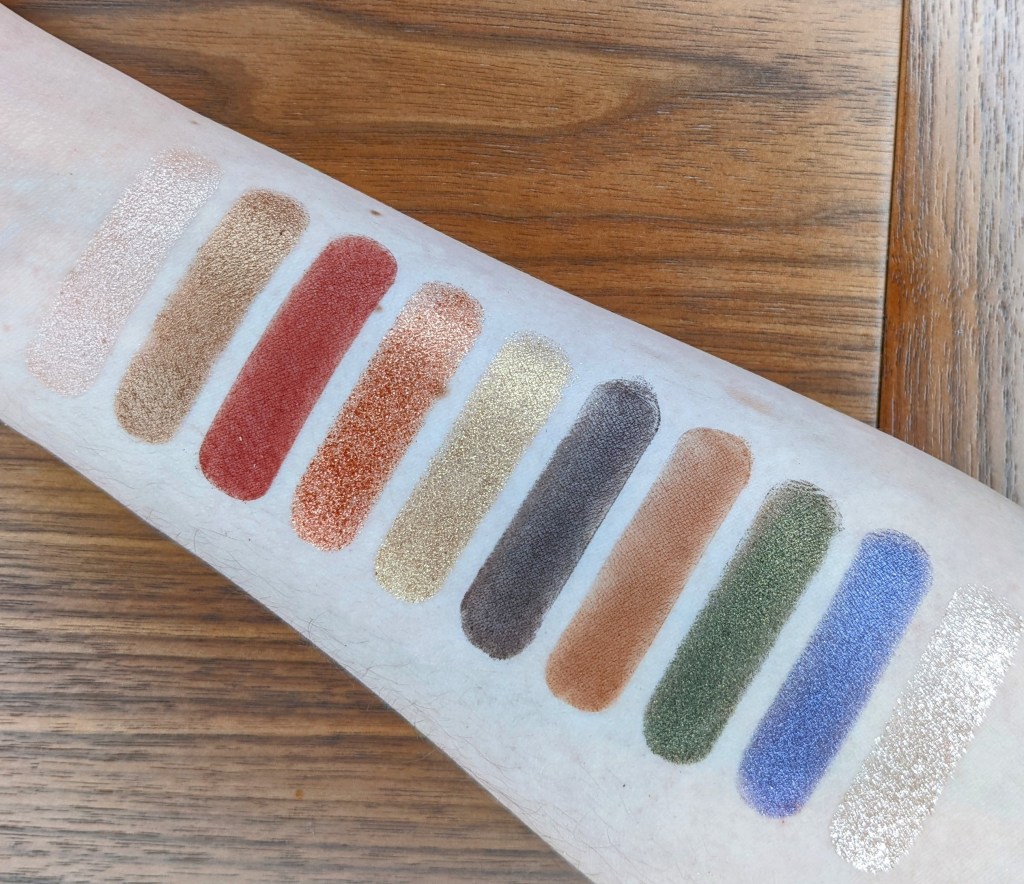 Vermillion Venom – This is a warm, deep burgundy red shade in the matte finish. This is the only shade in the palette I haven’t gotten any use of yet. It feels really smooth as I swatch it, so I’m sure it’s a lovely matte formula just like the rest of the mattes in this palette.