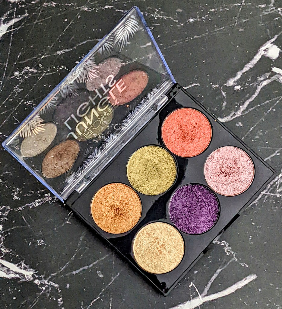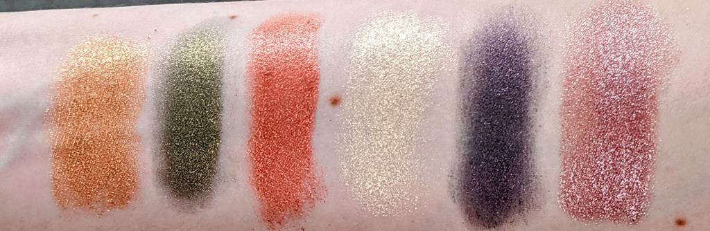 This palette has six super metallic and creamy (but still powder) shades. The formula is the same for all six shades, and they all perform equally well. They are extremely glittery, flaky, and shiny. Because they are highly pigmented and a bit chunky, the shadows can be a little difficult to blend – but I don’t mind because of how impactful they are. I primarily use this palette as six one-and-done shades or to pair with matte shadows from other palettes. Since all six shades are the same formula, I’ll just be going through the colors of each shade in the rest of this post.